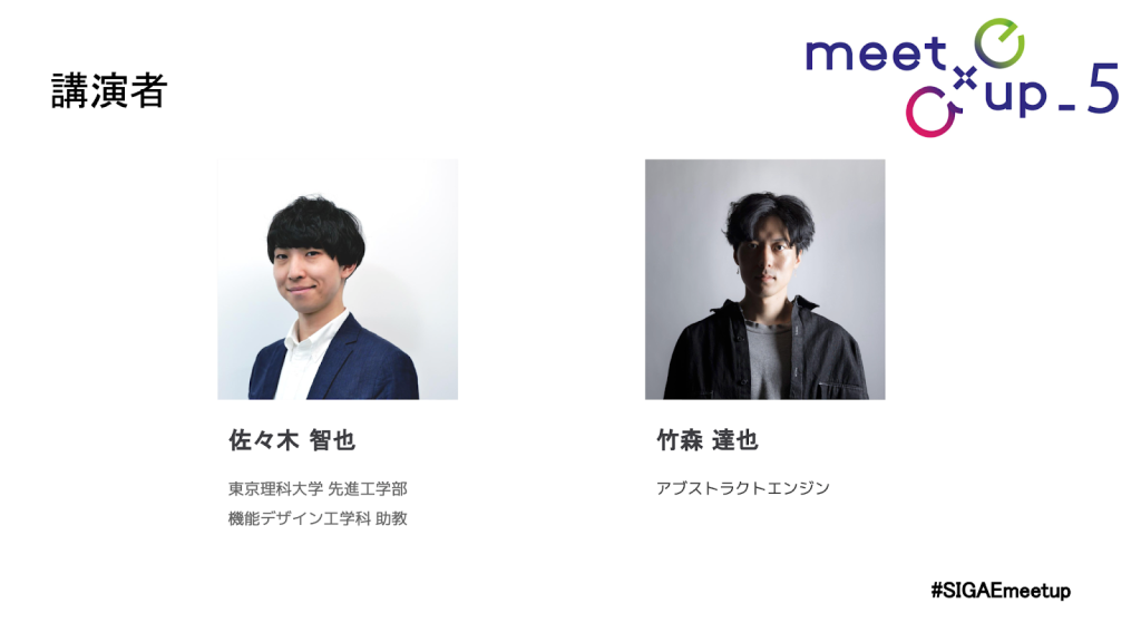 本イベントの講演者として、東京理科大学の佐々木智也氏と、アブストラクトエンジンの竹森達也氏が登壇し、それぞれの活動におけるプロトタイピングや展示についての事例や考え方についてご講演された。